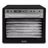 Oczywiście zalety dehydratora leżą gdzie indziej – dwustopniowy timer temperatury pilnuje, by obróbka żywności przebiegała w odpowiedniej temperaturze, a do tego cały proces zajmował mniej czasu. Wyświetlacz zapewni ci łatwą kontrolę, a technologia podwójnego wentylatora zapewni równomierny przepływ na wszystkich tackach.